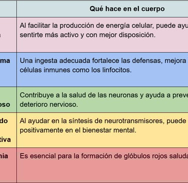 Contribuye al metabolismo energético: ayuda al cuerpo a transformar los alimentos en energía.