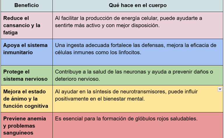 Aquí te muestro los beneficios clave que puede aportar la vitamina B12, especialmente si sientes agotamiento, bajas defensas o necesitas proteger tu sistema nervioso: